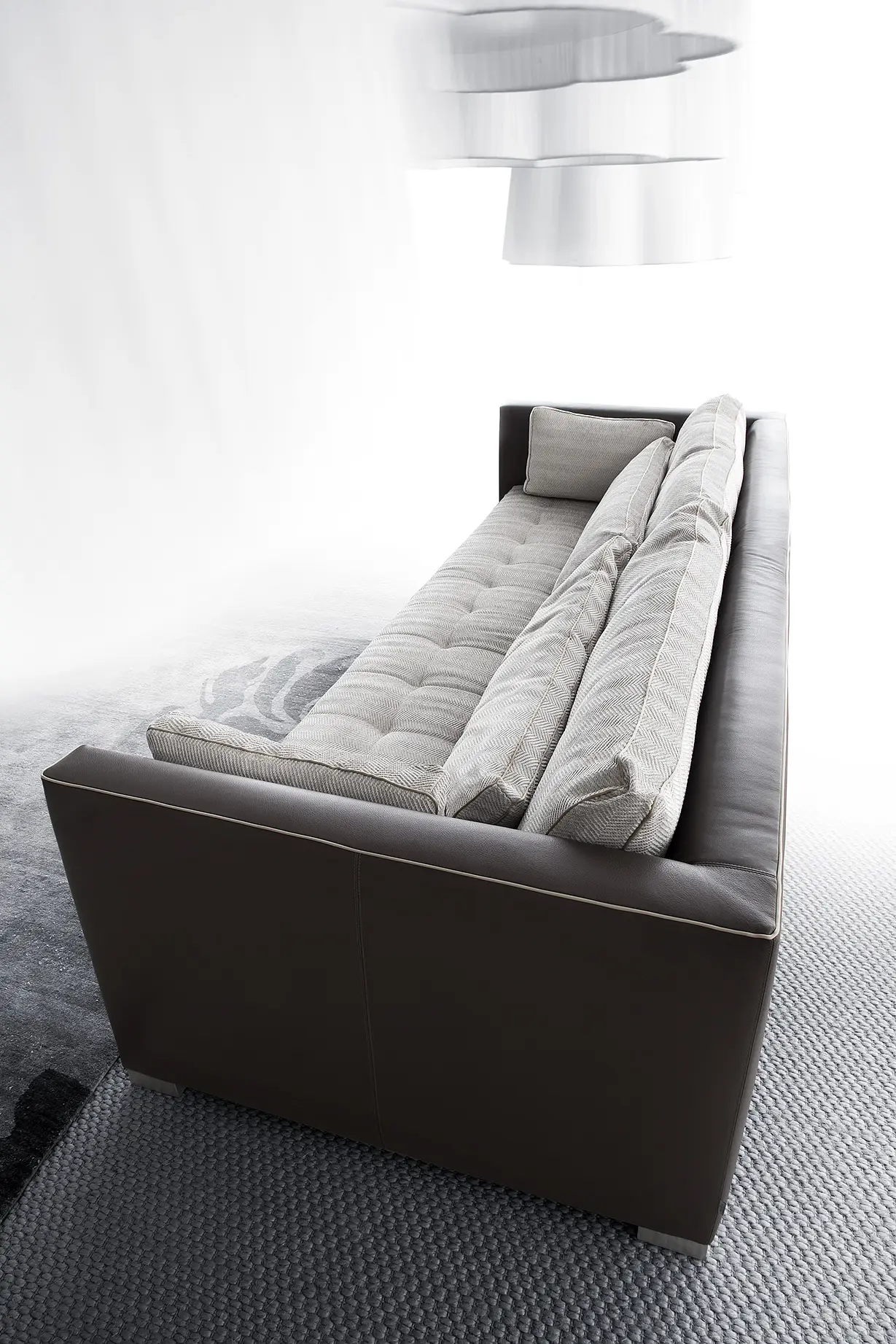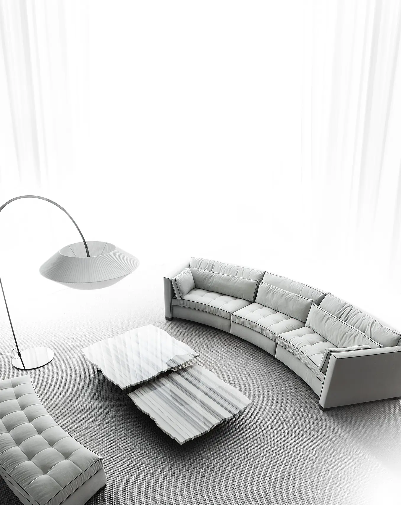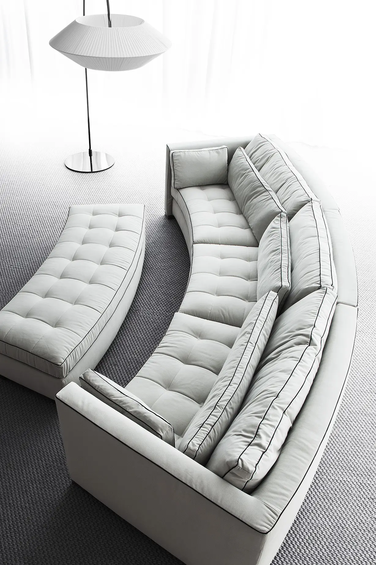 Alchimia is available in both linear and curved versions, and can be upholstered in fabric or leather.