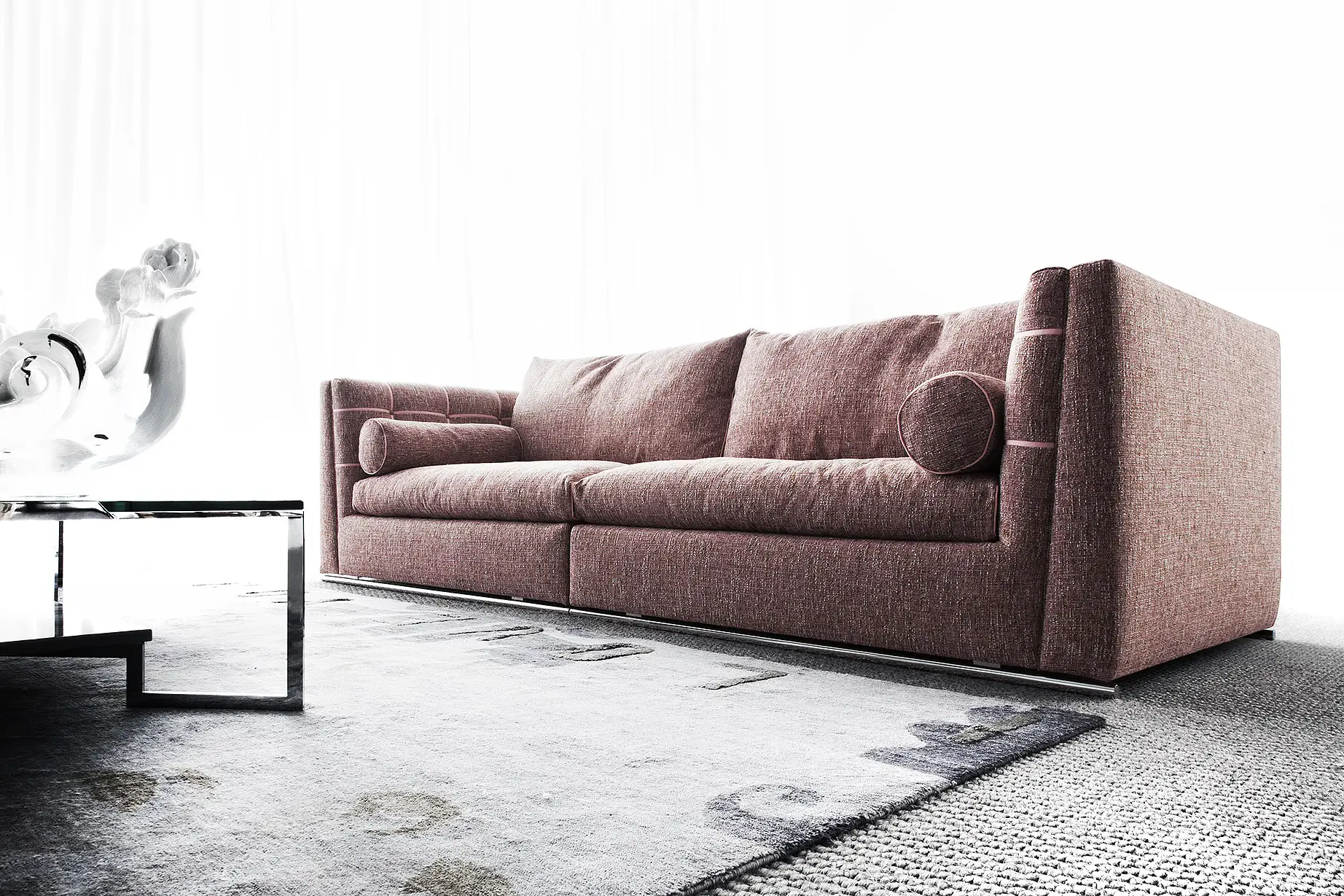 The seat is padded with non-deformable polyurethane foam and topped with virgin goose down. Both the backrest cushion and the bolster armrest cushion are also filled with virgin goose down. The design is completed by elegant steel feet with a polished chrome finish.Get Back is available in both fabric and leather upholstery.