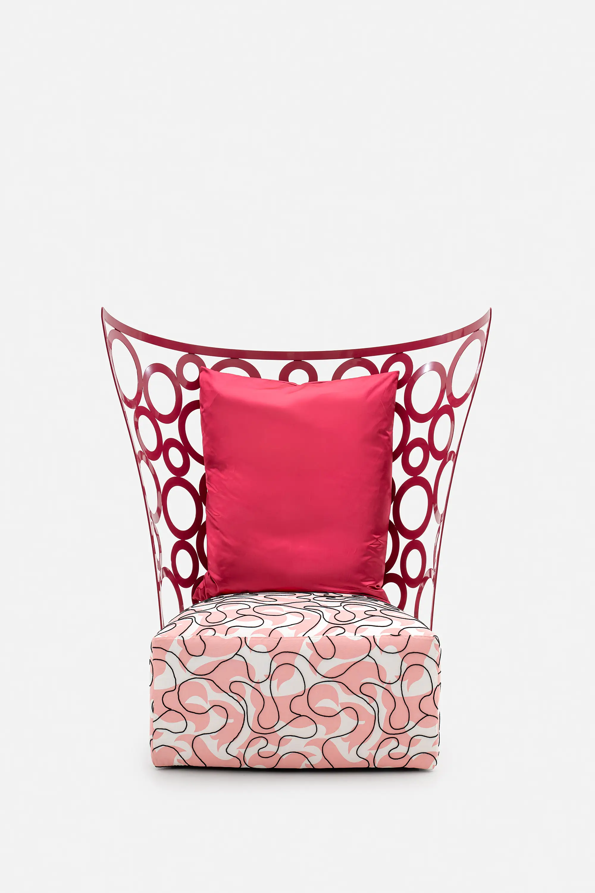 There are pieces of furniture that simply occupy a space, and then there is Icona. A sophisticated armchair designed to be the undisputed focal point of the room. What immediately captures the eye is its exposed metal backrest: a weave of interlocking circles that forms a bold and iconic graphic statement, poised between architecture and contemporary art.