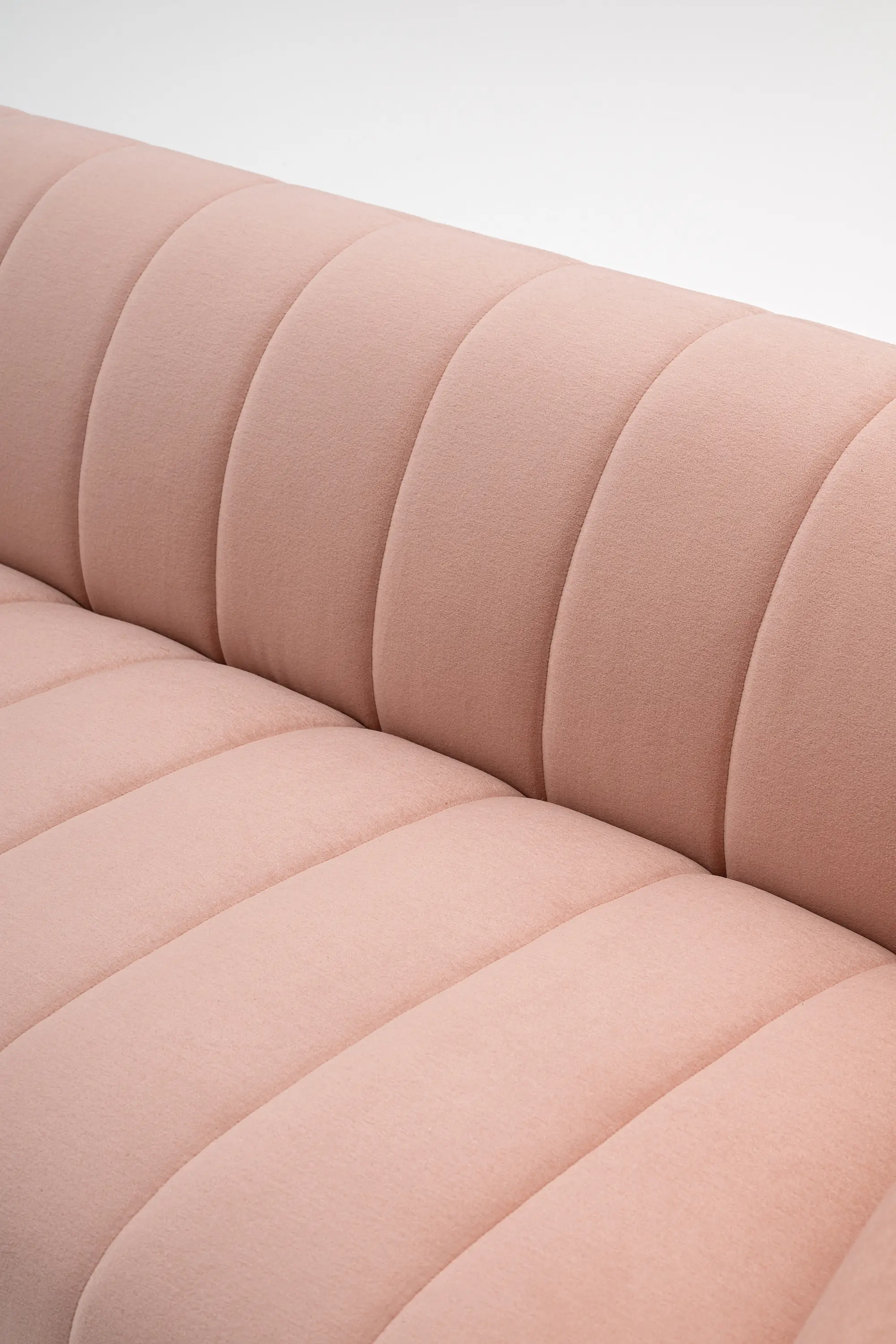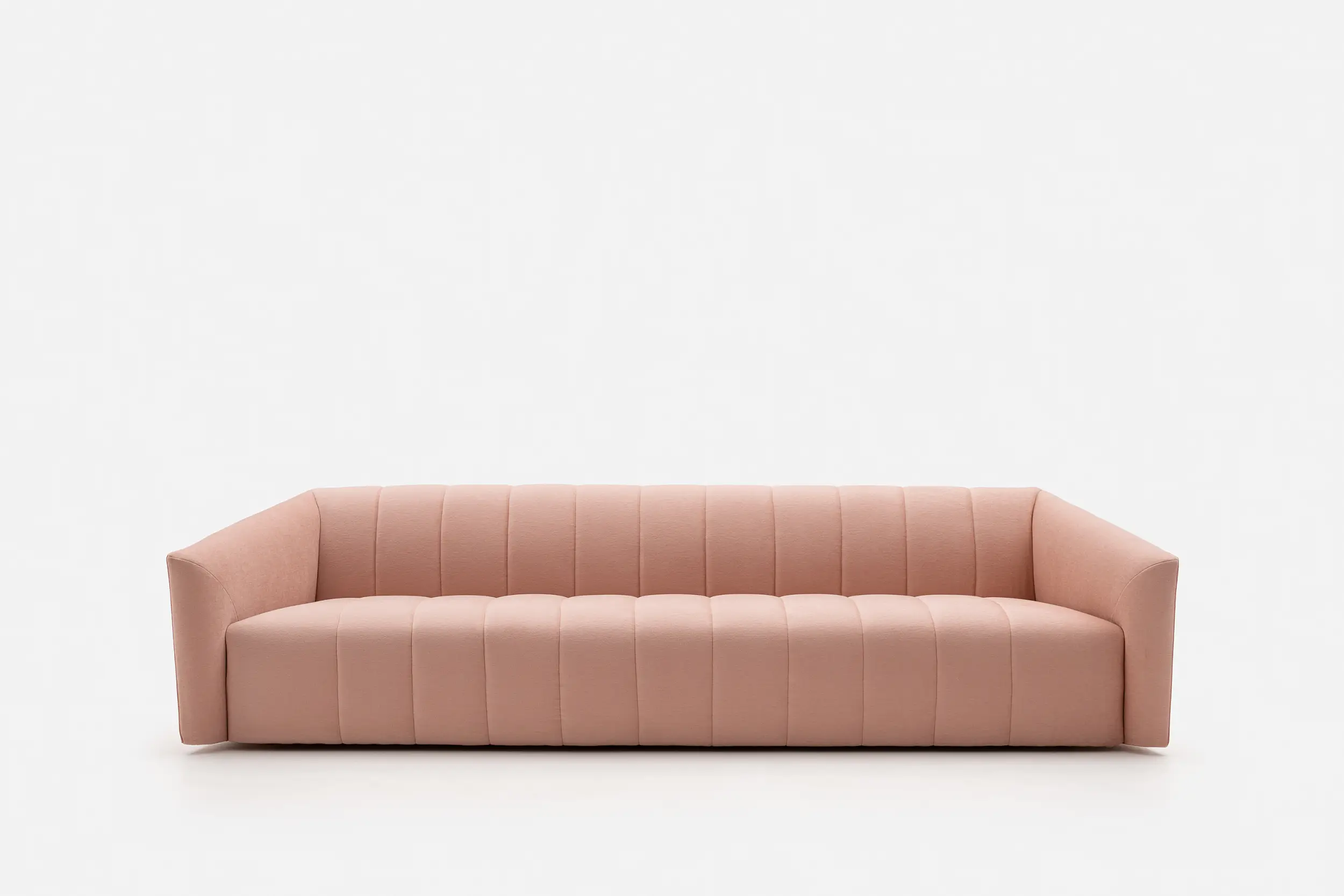 The backrest and armrests merge seamlessly into a single, continuous shell, elegantly defined by vertical quilting. This soft geometry enhances the sofa’s silhouette, giving it a magnetic presence from every possible angle.