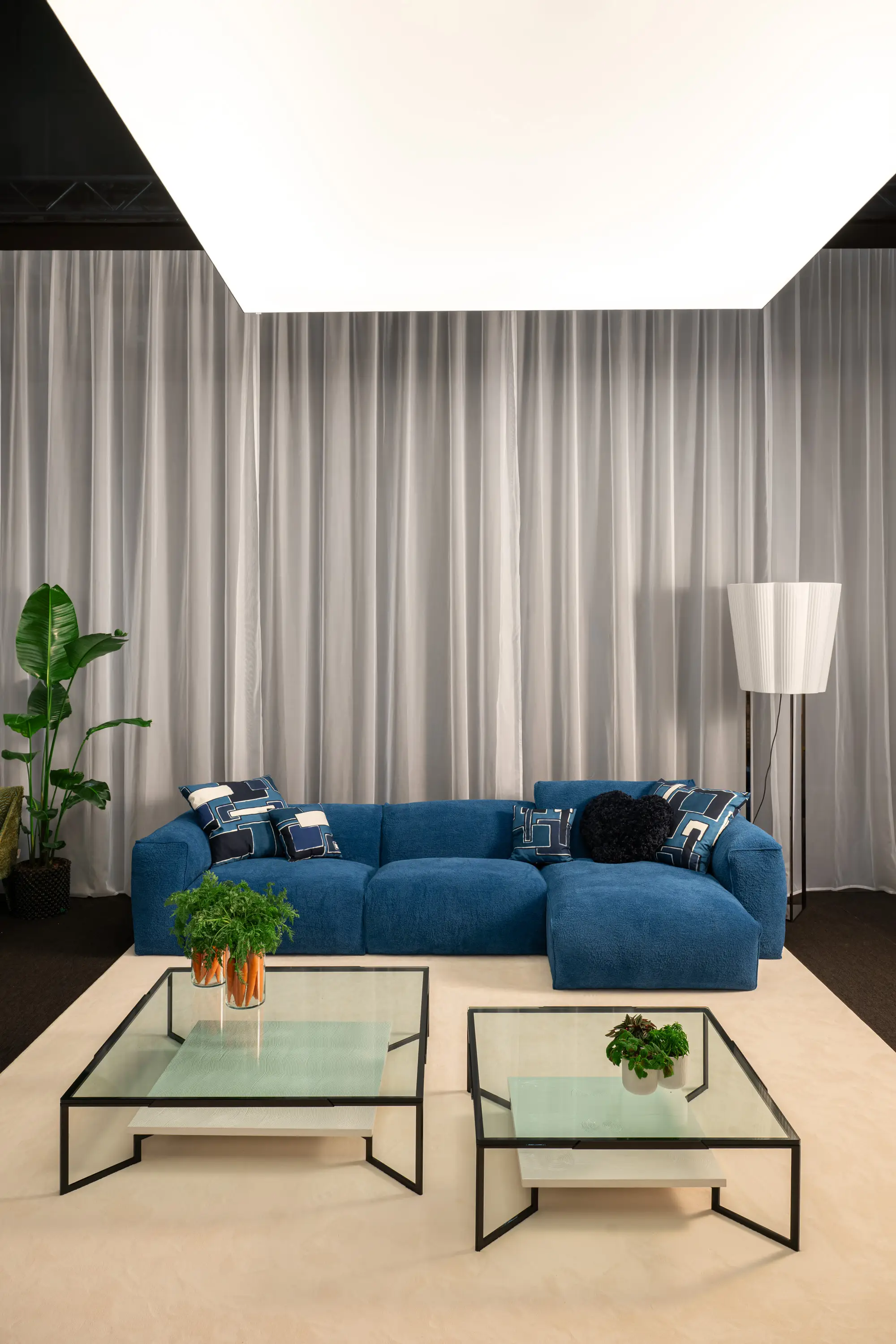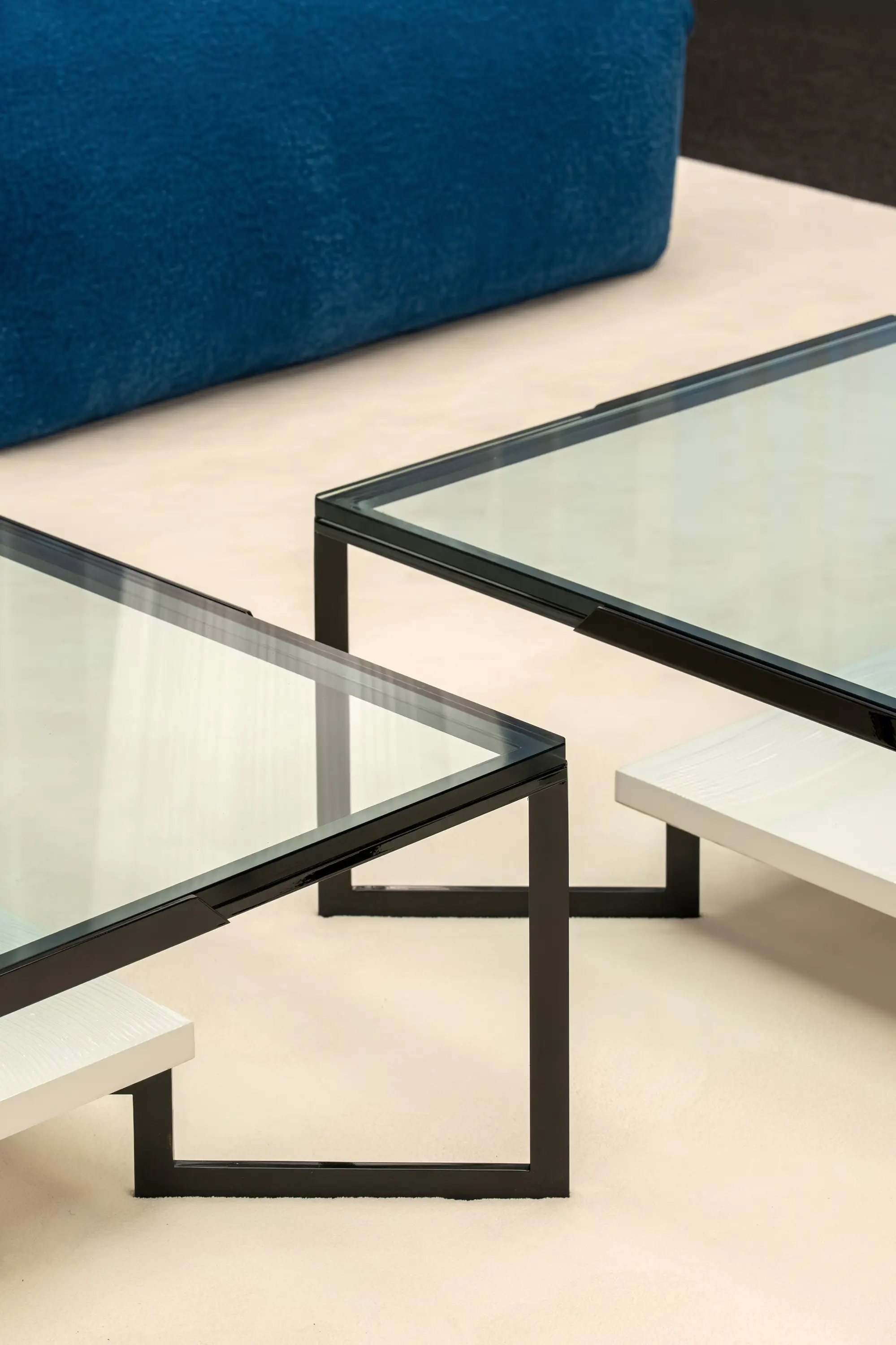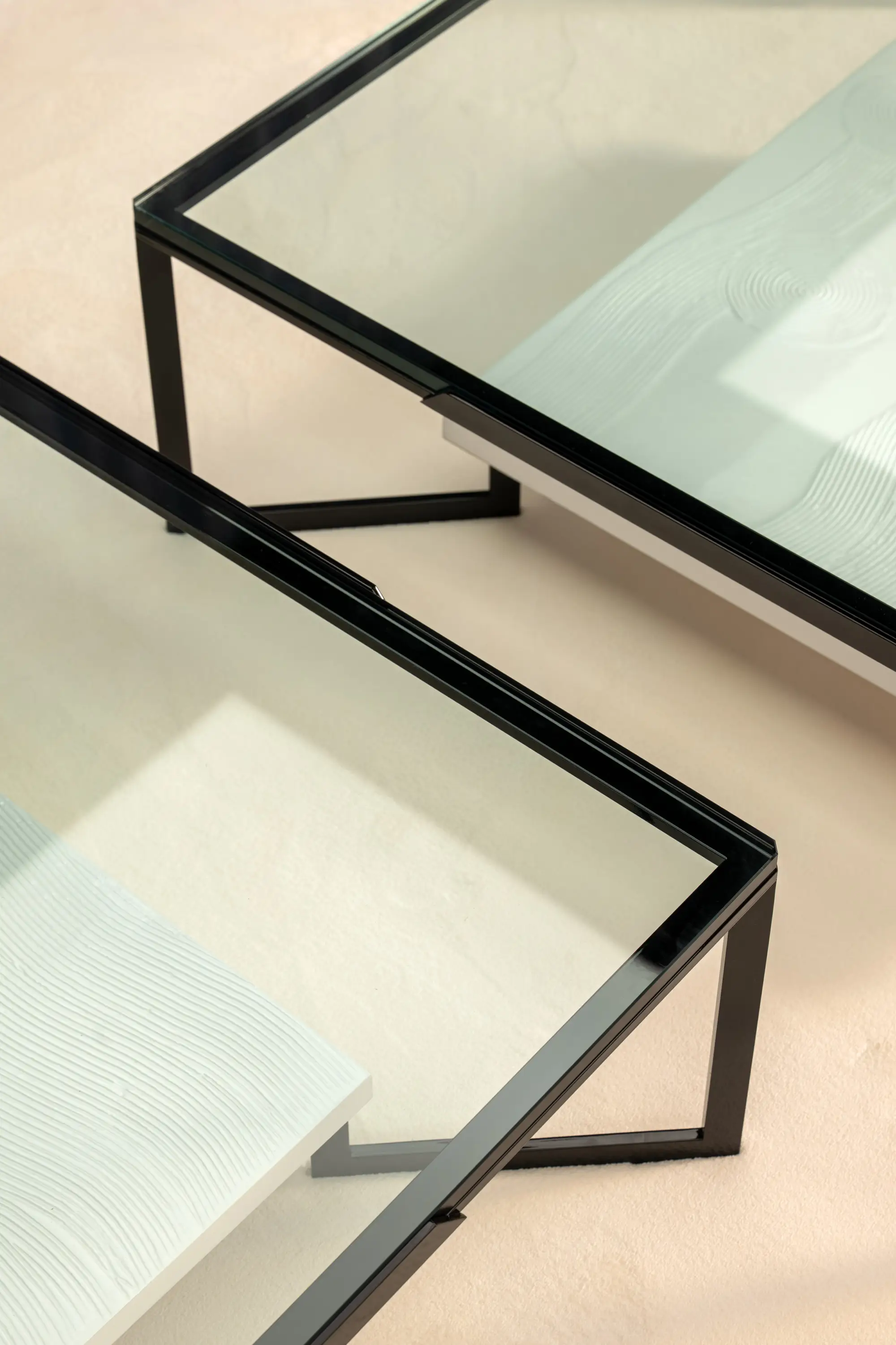 Paso Doble features a metal structure with a geometric design. The 15 mm tempered glass top creates a play of transparencies that enhances the decorative lower surface, available in different finishes.