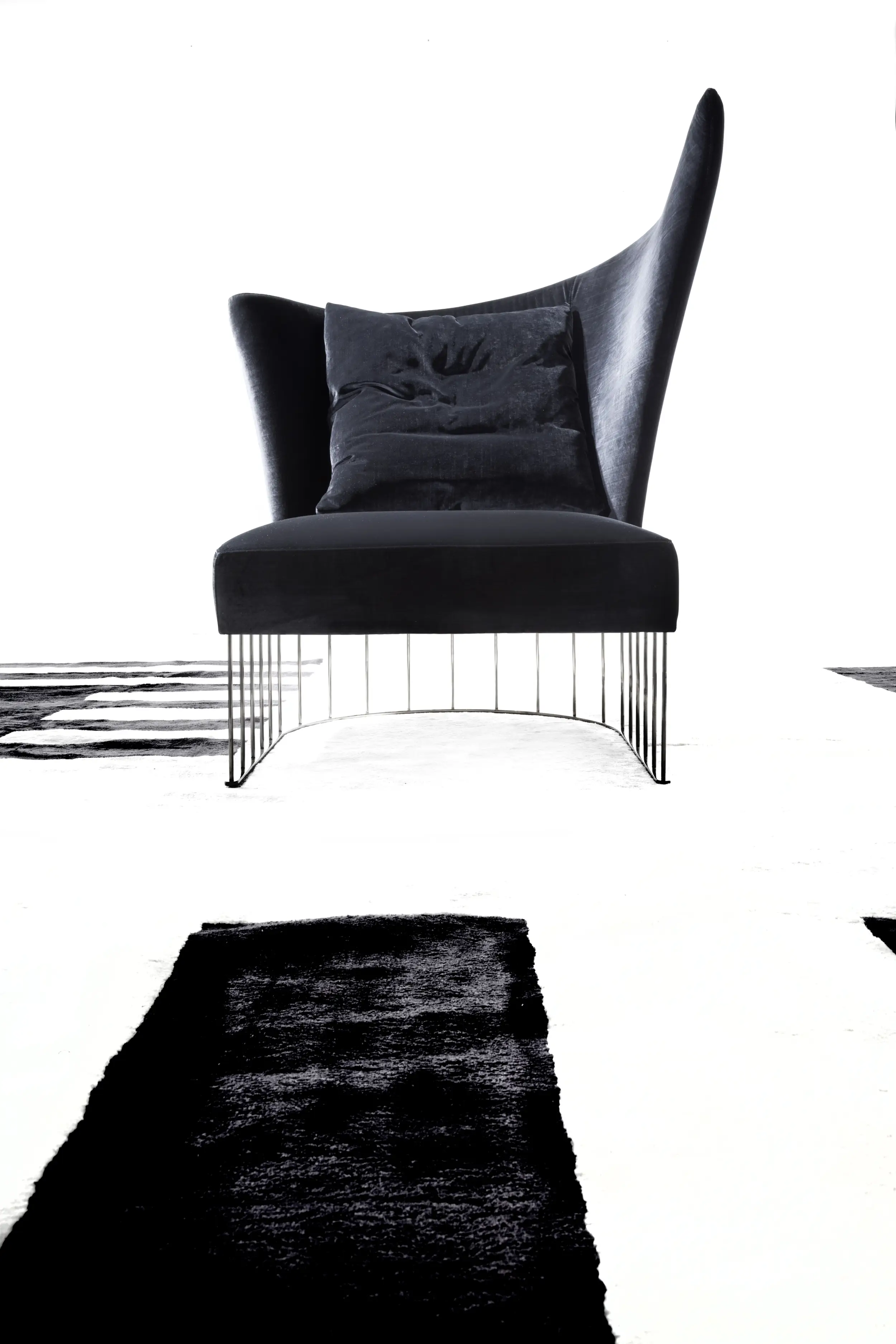 Unique in its shape, elegant and precious, Virgola exudes an intense and magnetic charm. An armchair that confidently sculpts the space, creating a sophisticated and mysterious atmosphere. Virgola is designed for interiors with a strong identity, where elegance meets bold character.